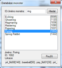 • Kliknutím na vyhledané monstrum se nám v dolní části okna zobrazí Jméno, ID a především všechny Lokace, na kterých se monstrum nachází. Důležité je zkontrolovat lokace, mnohdy mají monstra stejné jméno, ale jiné ID. :-)